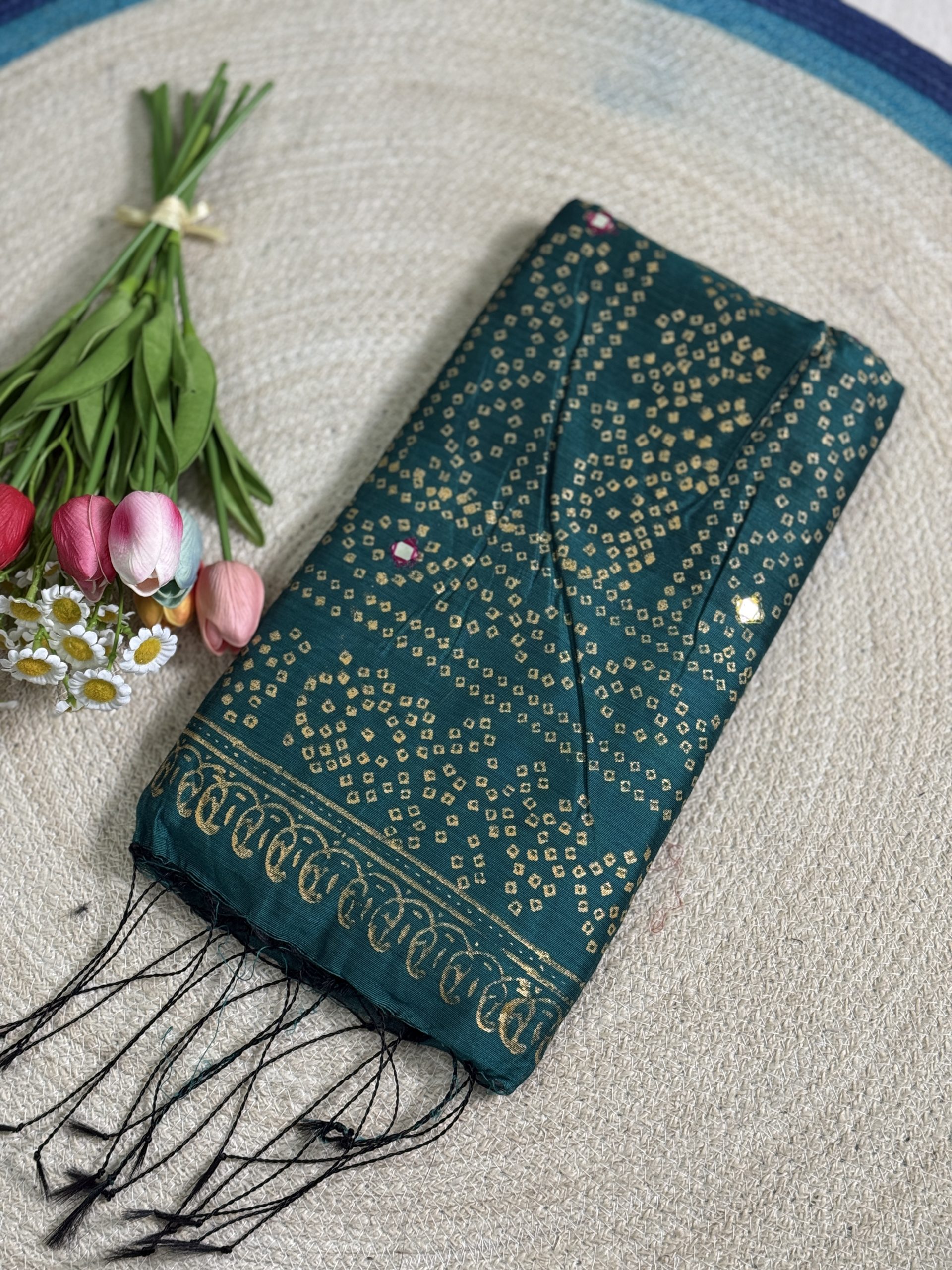 এই প্রিমিয়াম চণ্ডী কটন শাড়িটি ঐতিহ্য এবং আধুনিক ফ্যাশনের এক অনবদ্য মিশ্রণ। গভীর, জমকালো ময়ূরকণ্ঠী সবুজ (Peacock Green) রঙটি দিনের আলোয় এবং কৃত্রিম আলোয় ভিন্ন আভা ছড়ায়, যা এটিকে অনন্য করে তোলে। সোনালী রঙের বিন্দুর ছাপ এবং সূক্ষ্ম আয়নার কাজ (Mirror/Shisha Work) শাড়িটির সৌন্দর্য বহু গুণ বাড়িয়ে দিয়েছে।