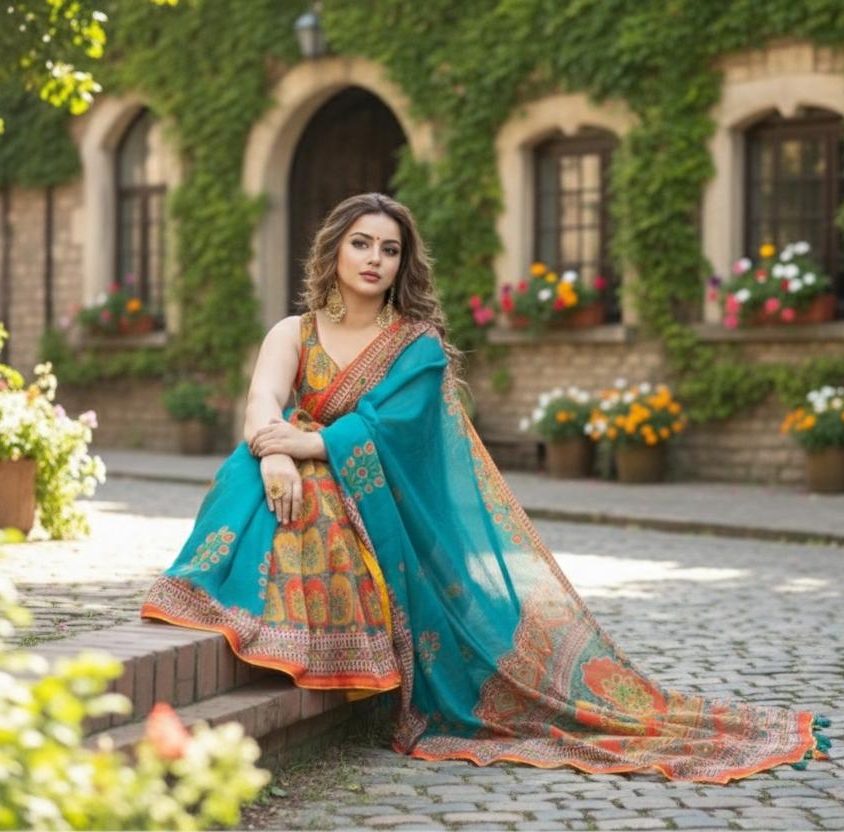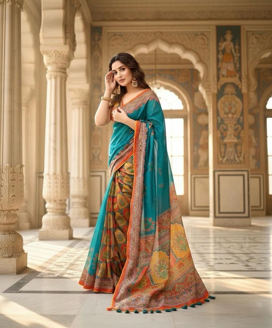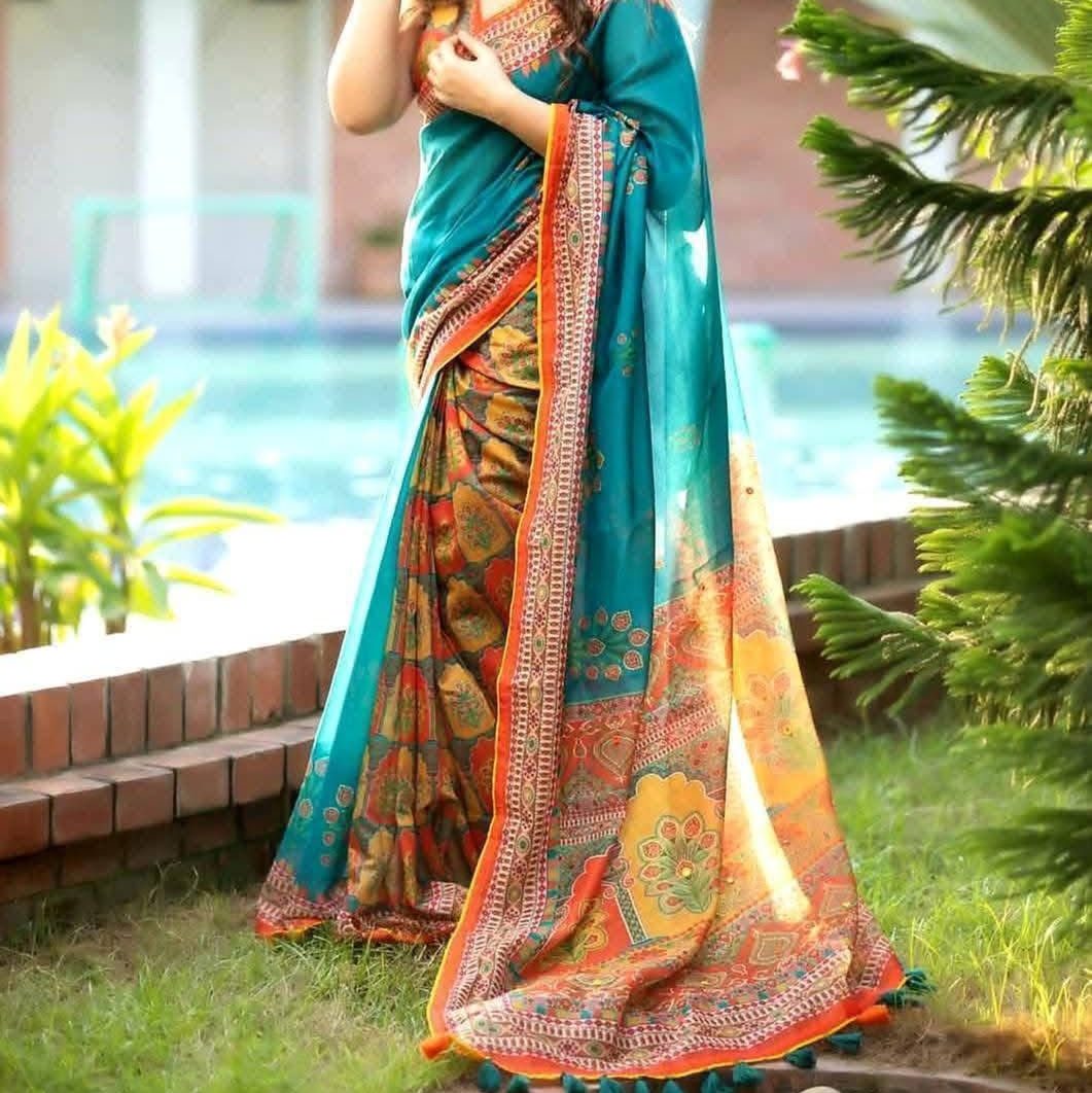 ডিজিটাল প্রিন্টেড সেমি মসলিন শাড়ি – এলিগ্যান্ট সি গ্রিন ও মাল্টিকালার ফ্লোরাল ডিজাইন