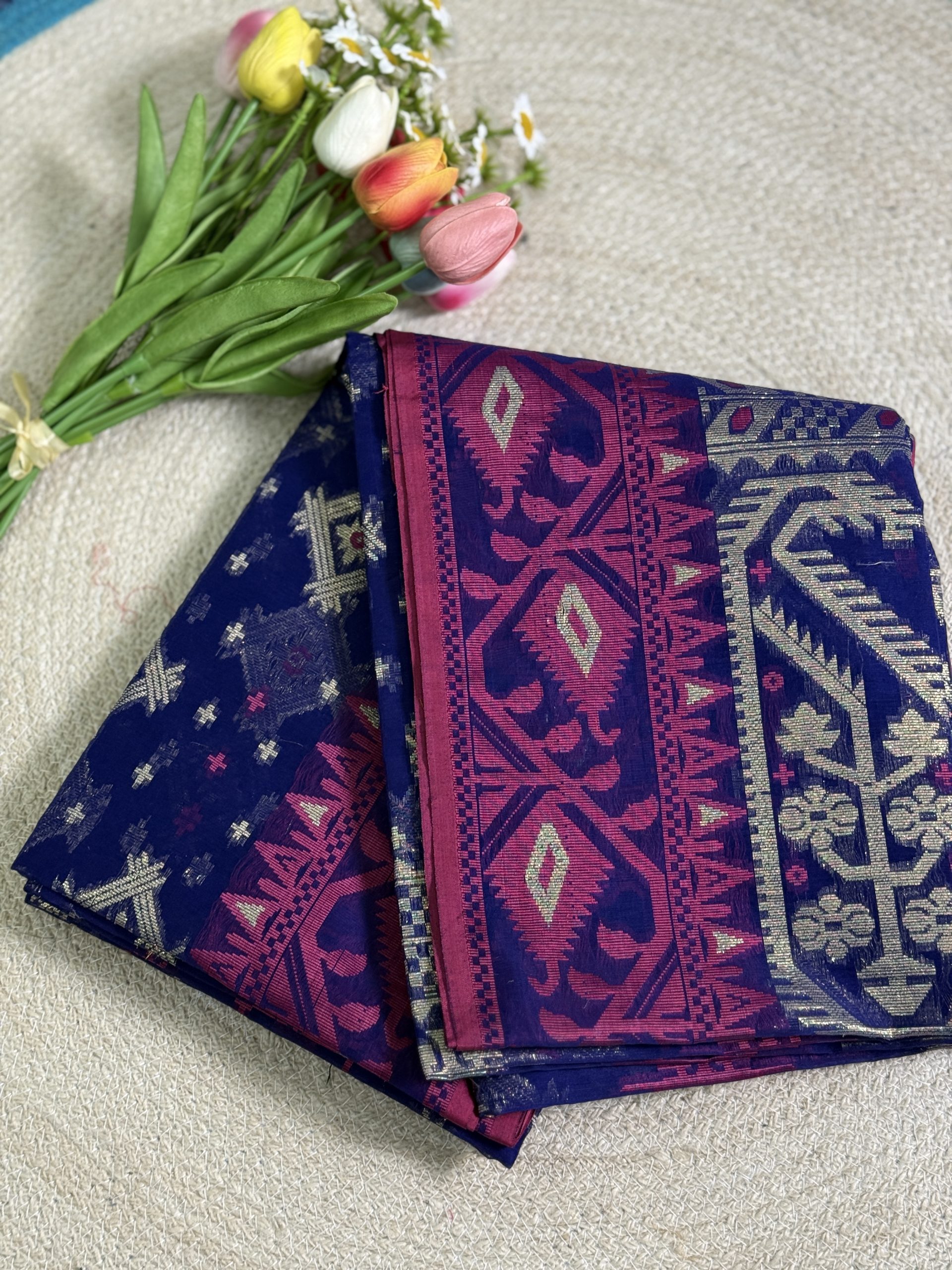 ✨ স্টক সীমিত—এখনই অর্ডার করুন আপনার কালেকশনে এই রাজকীয় ডিপ ব্লু জামদানি শাড়িটি যোগ করতে!