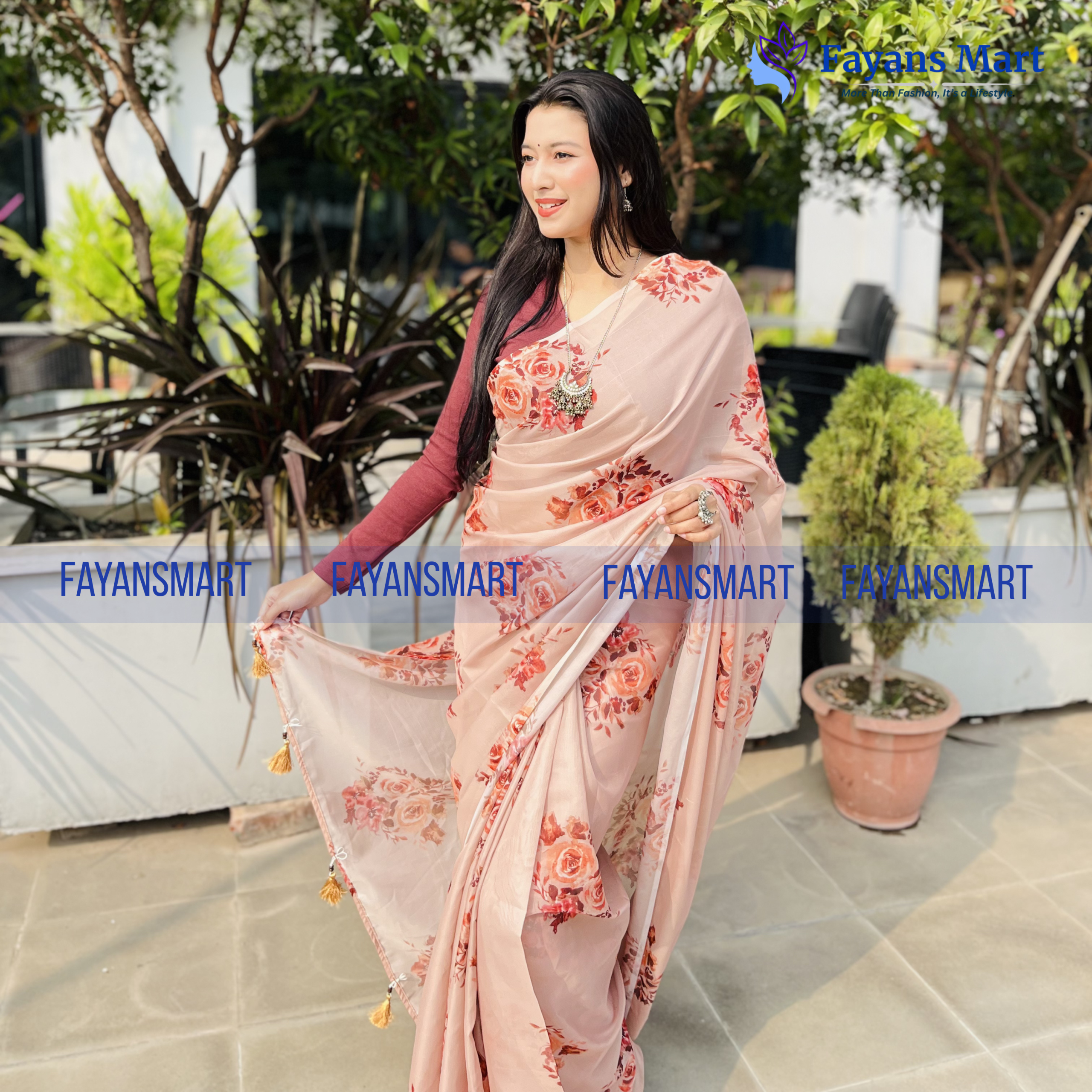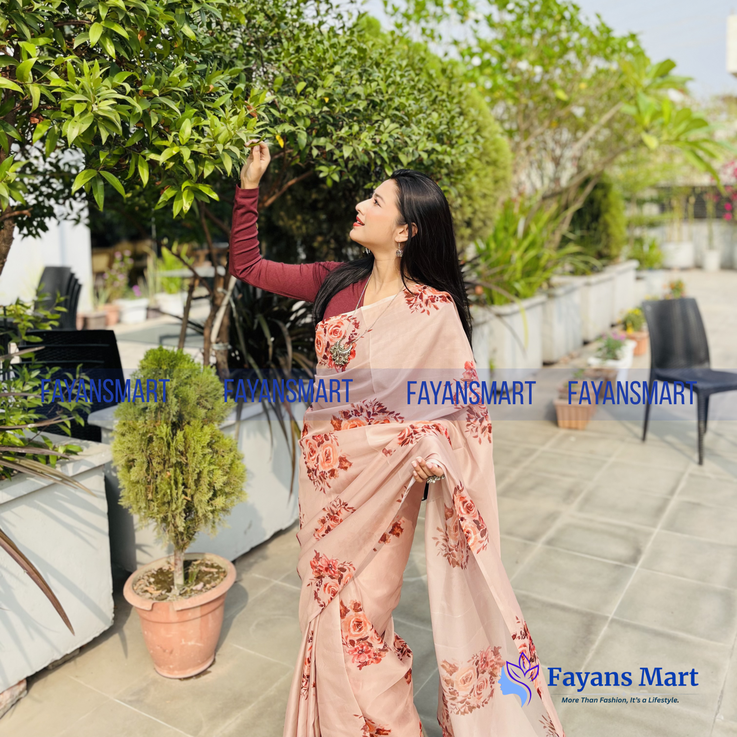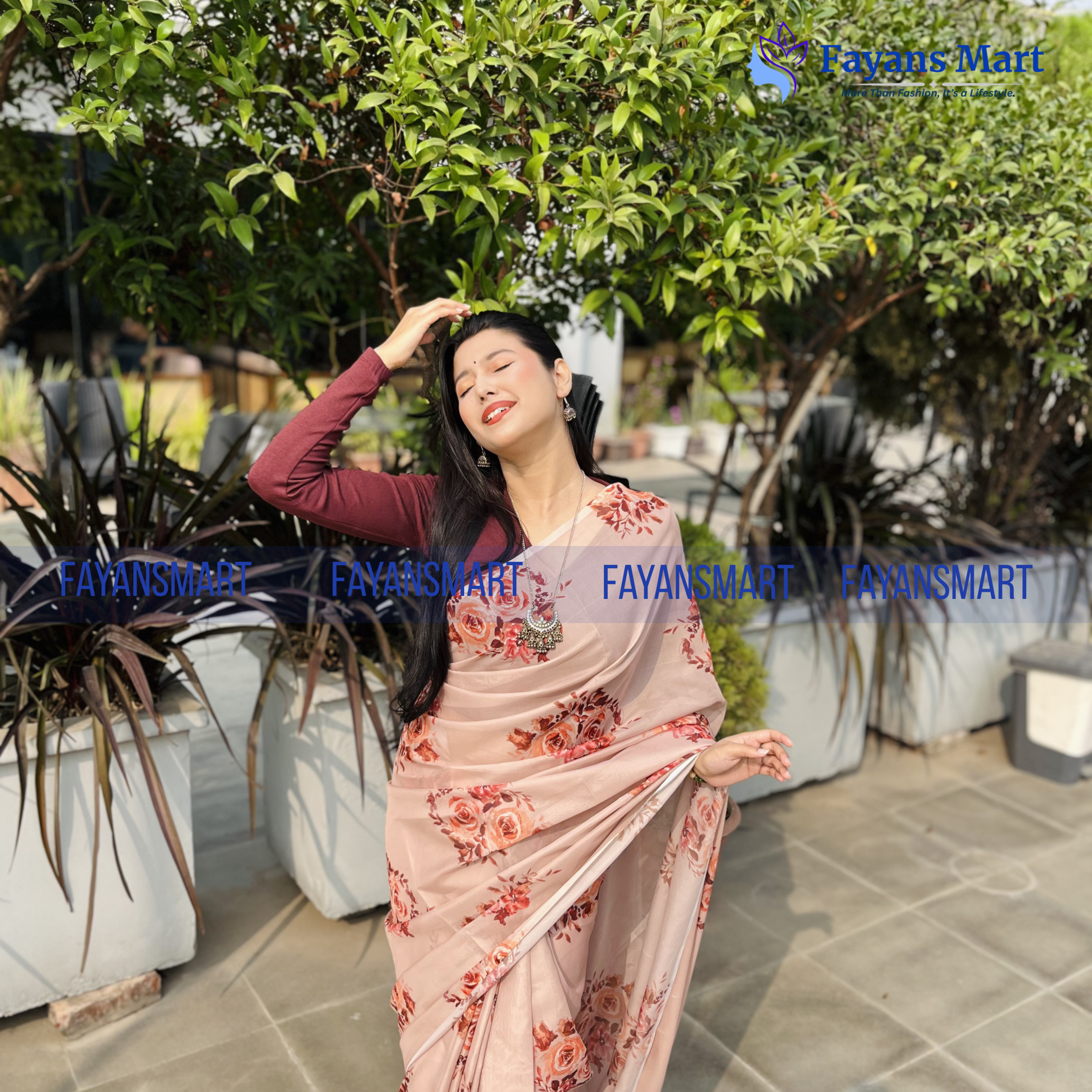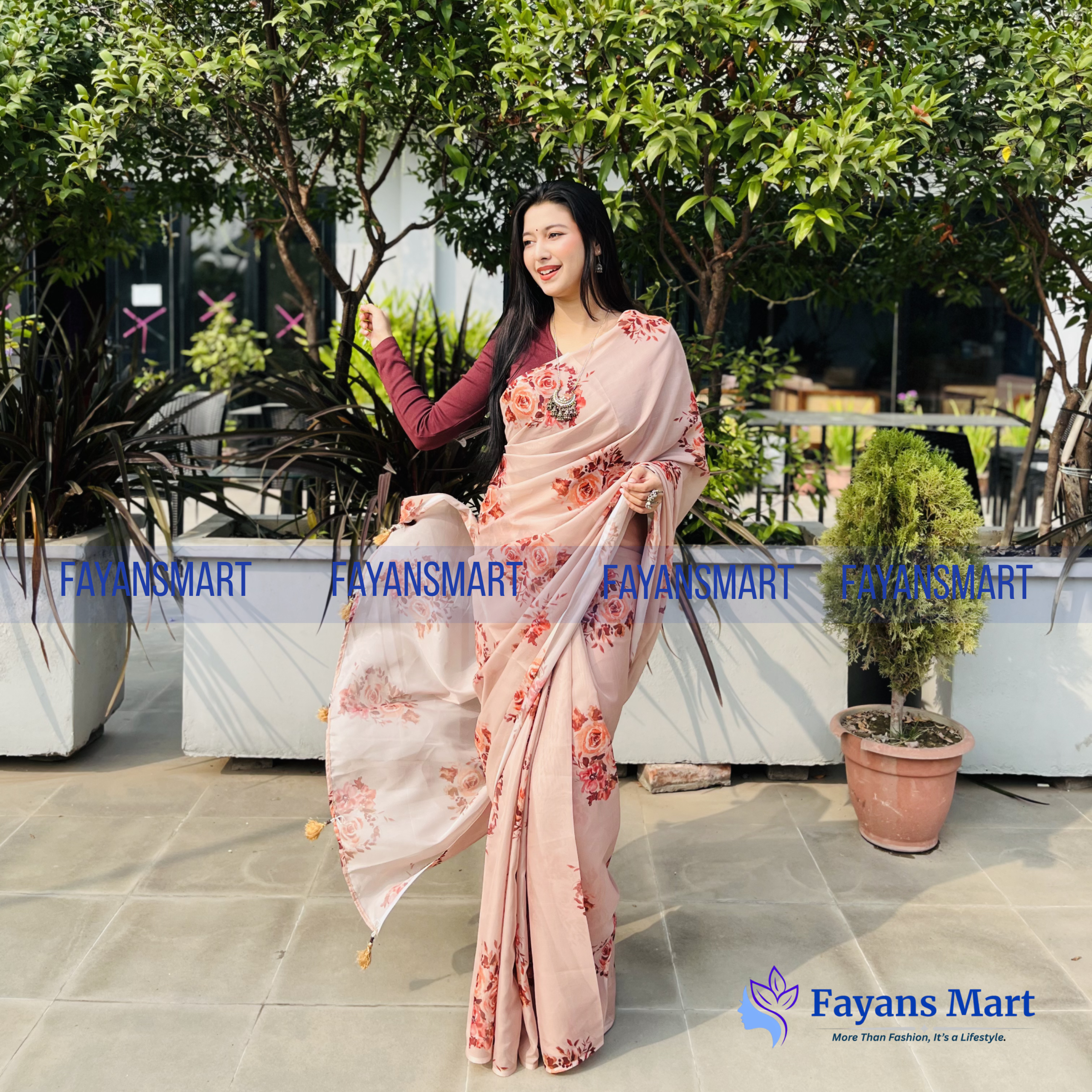 ফেব্রিক কোয়ালিটি: ১০০% অরিজিনাল ইন্ডিয়ান পিওর শিফন জর্জেট। এটি অত্যন্ত মসৃণ এবং দীর্ঘক্ষণ পরে থাকার জন্য আরামদায়ক।