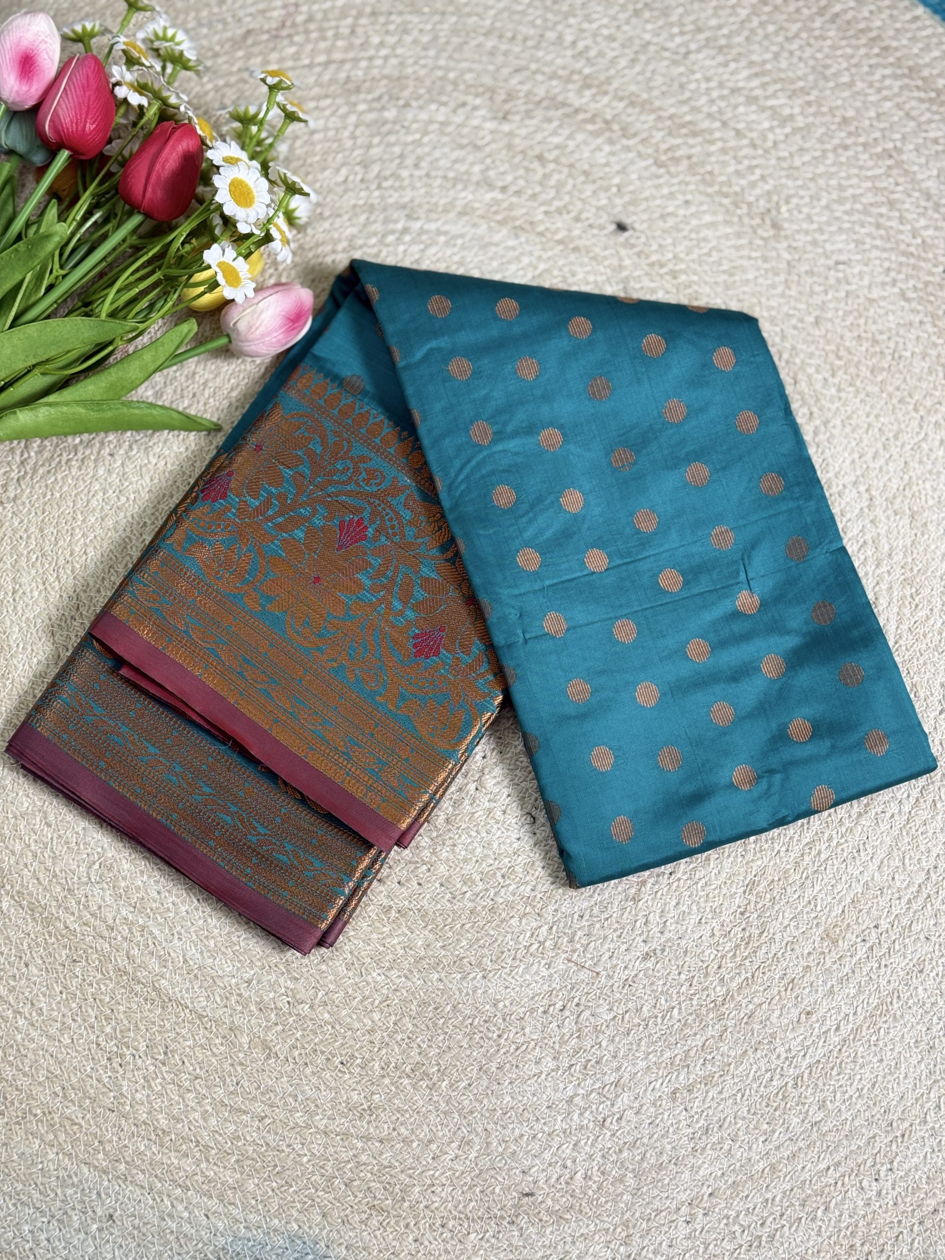 সাজে চাই পরিমিত আভিজাত্য আর প্রিমিয়াম লুক? তাহলে এই ডিপ সি গ্রিন কাতান শাড়ি আপনার জন্য একদম পারফেক্ট। নীলচে সবুজ রঙের গভীর টোনের সাথে বডিতে রয়েছে কপার/গোল্ডেন ডট ডিজাইন, আর পাড়–আঁচলে আছে কপার-গোল্ড জরি কাজ (ফ্লোরাল মোটিফ) যা শাড়িটিকে দিয়েছে একেবারে লাক্সারি ফিনিশ। অনুষ্ঠান, দাওয়াত বা পার্টি—সব জায়গায় এটি আপনাকে করবে এলিগ্যান্ট ও নজরকাড়া।