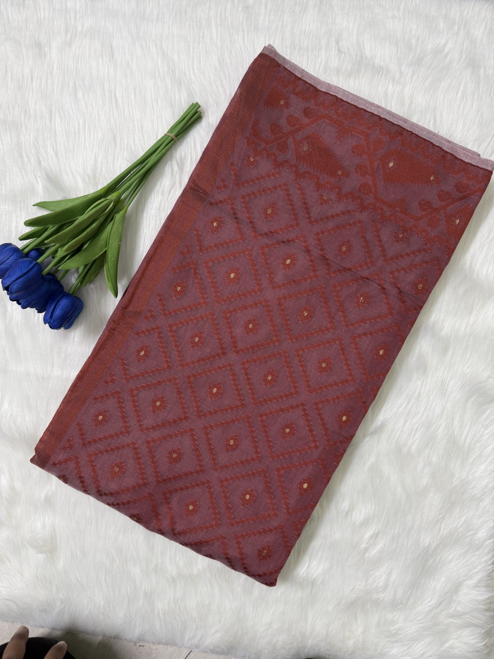 কমফোর্ট + ক্লাস—এই লালচে-বাদামি খাদি জামদানি শাড়ি আপনার কালেকশনে থাকলেই যেকোনো দিনে আপনি দেখাবেন আরও গুছানো ও রুচিশীল।