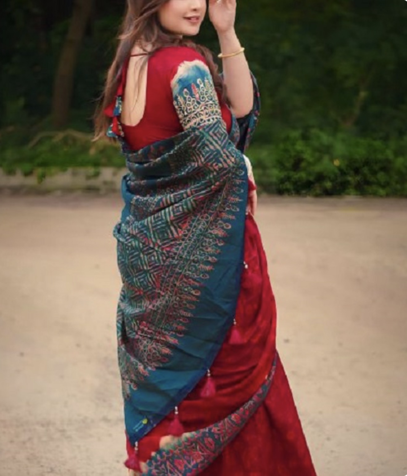 ডিজাইন: শাড়ি জুড়ে রয়েছে ট্র্যাডিশনাল বাটিক প্রিন্ট এবং আঁচলে জ্যামিতিক নকশার নিখুঁত কাজ। আঁচলের নিচের দিকে ঝালর (Tassel) দেওয়া হয়েছে যা শাড়িটির সৌন্দর্য বাড়িয়ে দিয়েছে কয়েকগুণ।