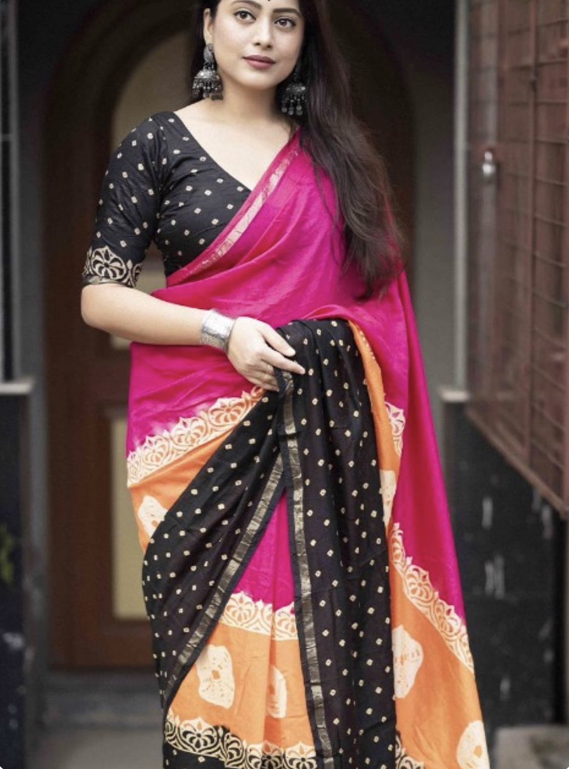 আপনার বিশেষ দিনগুলোকে আরও রঙিন এবং স্মৃতিময় করে তুলতে আমরা নিয়ে এসেছি চমৎকার ডিজাইনের এই সেমি মসলিন সিল্ক শাড়ি। শাড়িটি মূলত মেজেন্টা এবং কালো রঙের একটি দারুণ ফিউশন, যা আপনাকে দেবে এক রাজকীয় লুক।