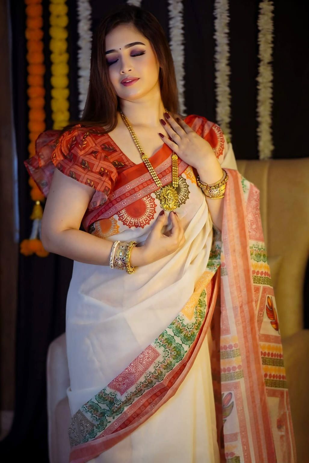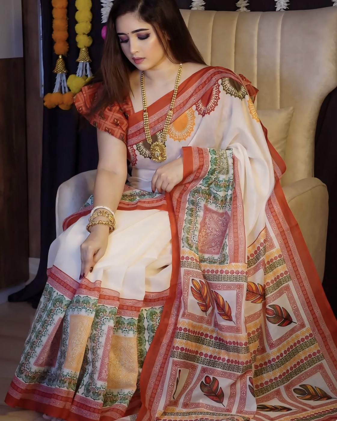 নান্দনিক ডিজাইন: শাড়ির পাড় এবং আঁচলে রয়েছে আকর্ষণীয় প্রিন্ট ওয়ার্ক, যা আপনার লুকে যোগ করবে বাড়তি আভিজাত্য।
