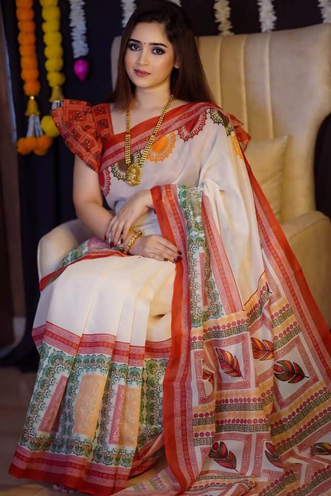 ব্লাউজ পিস: শাড়ির সাথে মানানসই রাফেল স্লিভ বা ডিজাইনার ব্লাউজ দিয়ে পরলে আপনাকে দেখাবে অনন্য।